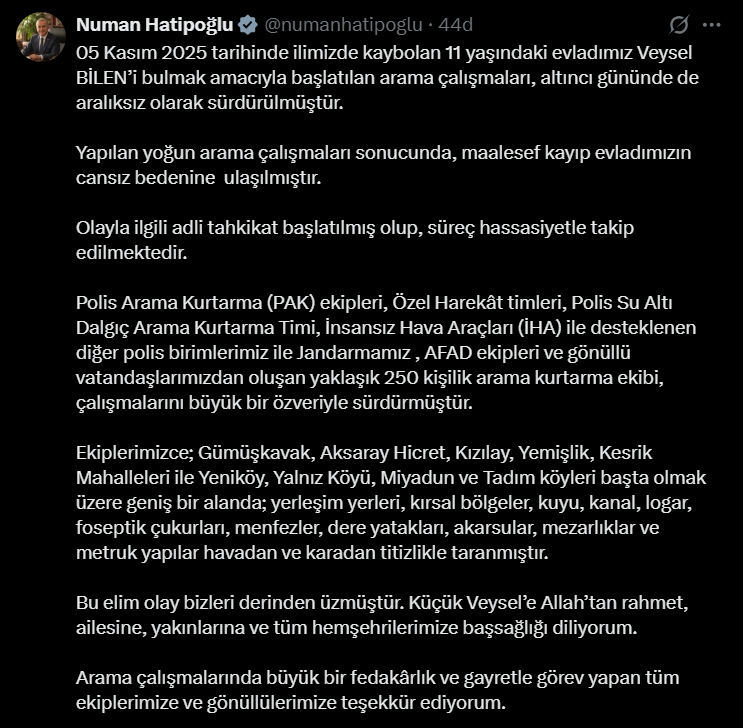 Bilen, “05 Kasım 2025 tarihinde ilimizde kaybolan 11 yaşındaki evladımız Veysel Bilen’i bulmak amacıyla başlatılan arama çalışmaları, altıncı gününde de aralıksız olarak sürdürülmüştür. Yapılan yoğun arama çalışmaları sonucunda, maalesef kayıp evladımızın cansız bedenine ulaşılmıştır. Olayla ilgili adli tahkikat başlatılmış olup, süreç hassasiyetle takip edilmektedir. Polis Arama Kurtarma (PAK) ekipleri, Özel Harekat timleri, Polis Su Altı Dalgıç Arama Kurtarma Timi, İnsansız Hava Araçları (İHA) ile desteklenen diğer polis birimlerimiz ile Jandarmamız, AFAD ekipleri ve gönüllü vatandaşlarımızdan oluşan yaklaşık 250 kişilik arama kurtarma ekibi, çalışmalarını büyük bir özveriyle sürdürmüştür. Ekiplerimizce; Gümüşkavak, Aksaray Hicret, Kızılay, Yemişlik, Kesrik Mahalleleri ile Yeniköy, Yalnız köyü, Miyadun ve Tadım köyleri başta olmak üzere geniş bir alanda; yerleşim yerleri, kırsal bölgeler, kuyu, kanal, logar, foseptik çukurları, menfezler, dere yatakları, akarsular, mezarlıklar ve metruk yapılar havadan ve karadan titizlikle taranmıştır. Bu elim olay bizleri derinden üzmüştür. Küçük Veysel’e Allah’tan rahmet, ailesine, yakınlarına ve tüm hemşehrilerimize başsağlığı diliyorum. Arama çalışmalarında büyük bir fedakarlık ve gayretle görev yapan tüm ekiplerimize ve gönüllülerimize teşekkür ediyorum” ifadelerini kullandı.