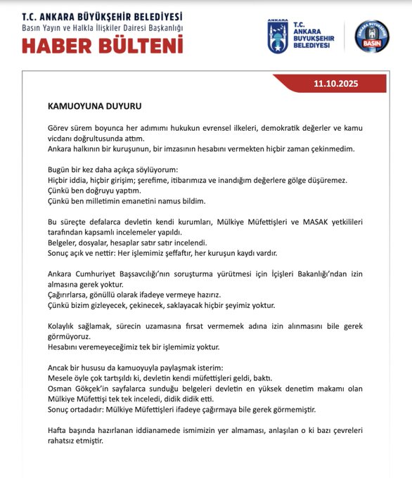 Ankara Büyükşehir Belediye Başkanı Mansur Yavaş, Ankara Cumhuriyet Başsavcılığı’nın İçişleri Bakanlığı’ndan soruşturma izni istemesiyle ilgili olarak yaptığı ilk açılamada, “Ankara Cumhuriyet Başsavcılığı’nın soruşturma yürütmesi için İçişleri Bakanlığı’ndan izin almasına gerek yoktur. Çağırırlarsa, gönüllü olarak ifade vermeye hazırız çünkü bizim gizleyecek, çekinecek, saklayacak hiçbir şeyimiz yoktur Kolaylık sağlamak, sürecin uzamasına fırsat vermemek adına izin alınmasını bile gerek görmüyoruz. Hesabını veremeyeceğimiz tek bir işlemimiz yoktur” dedi.